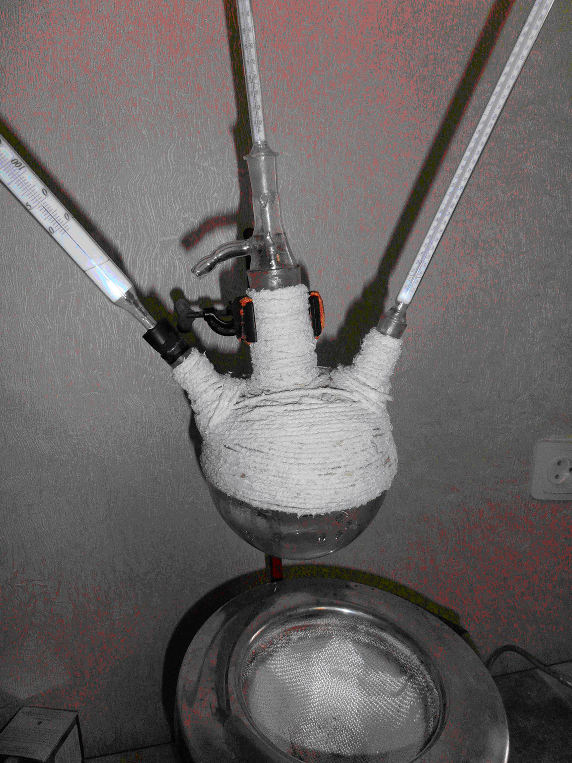 Во всех экспериментах использовалась трёх горловая колба объёмом 500 мл, количество перегоняемой жидкости составляло 150 мл. Колба помещалась в стандартную лабораторную колбогрейку. Для термоизоляции верхняя часть колбы, которая выступала над нагревающей частью колбогрейки, обматывалась асбестовым шнуром. Мощность нагрева в контрольных и экспериментальных разгонках поддерживалась одинаковой. Измерялись три температуры: