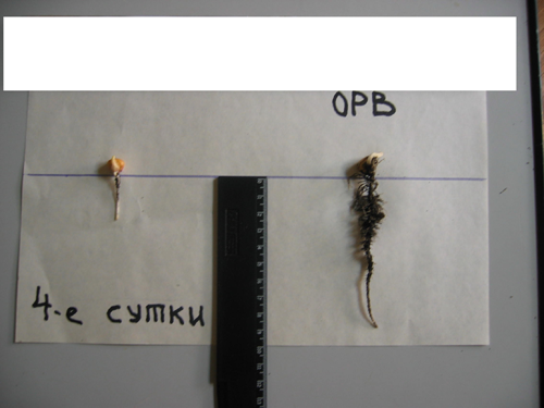 «Испытания ОРВ-технологии проводились дважды в период с 13.09.2007 г. и 19.10.2007 г. в соответствии с существующими методиками. Подтверждается, что использование ОРВ-технологии позволило ускорить всхожесть семян кукурузы на 2 дня, а начало темпов образования листьев на 3 дня по сравнению с контрольными. Отмечено появление значительного количества червей, что может являться одним из возможных эффектов использования ОРВ-технологии».