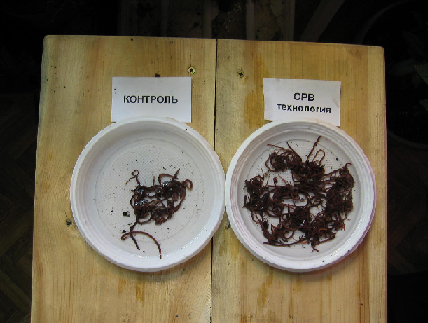 Такое значительное увеличение количества дождевых червей в опытном ящике мы можем объяснить тем, что активизация жизнедеятельности микроорганизмов привела к бурному их размножению из-за появления большого количество белковой пищи в виде активно размножающихся микроорганизмов, что способствовало и росту и размножению самих червей. Повторно проведенные лабораторные испытания ОРВ-технологии по одновременной активизации жизнедеятельности регенеративных микроорганизмов почвы и скорости размножения дождевых червей, проведенных в СГПУ «Моссельхоз» с конца декабря 2007г. по начало марта 2008г. показало, что за 74 дня количество червей увеличилось более чем в сорок раз. Если экстраполировать этот результат на год, то увеличение количества червей с помощью ОРВ-технологии не имеет аналогов в мировой практике и никакие калифорнийские черви не смогут конкурировать по продуктивности с червями, выращиваемыми с помощью ОРВ-технологии.
