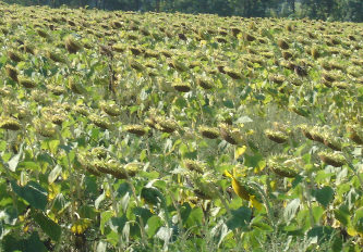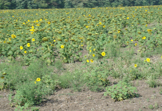 К сожалению, и агроном, и мы вынуждены были констатировать, что заморозки внесли существенные коррективы, эти поля придется пересеивать подсолнечником и с этими двумя полями, расположенными на несколько километров от основного пахотного клина хозяйства, мы ничего больше не делали. Только 18 августа, агроном привёз нас на эти поля, чтобы показать результаты развития подсолнечника, посеянного на них, см. фото.