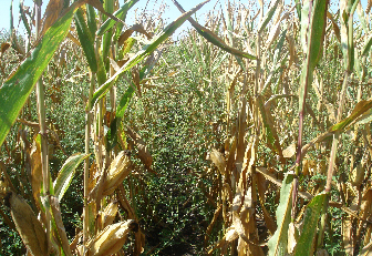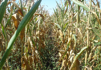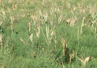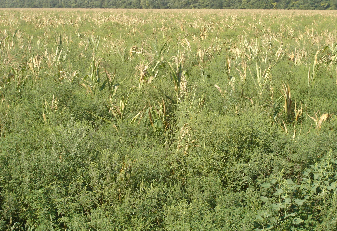 Следующий эксперимент проведен в этом же году в том же хозяйстве при работе с кукурузой. Были выделены два соседних поля, раздёленных лесополосой площадью, приблизительно по 80 га каждый. Структура и состав почвы этих полей практически одинаковы, так как последние шесть лет они засевались одинаковыми сельхоз культурами. В конце апреля оба поля засеяли кукурузой и первую активизацию скорости прорастания семян кукурузы с помощью нашей технологией в течение 8 дней по 12-14 часов в день мы проводили без дополнительной активизации жизнедеятельности регенерирующих микроорганизмов. Всё-таки, некоторая неопределённость в результатах на полях, засеянных овсом, остановила нас, на кону стояла урожайность поля в 80 га. На следующий месяц, когда мы приехали в Тихорецк, нам сообщили приятную новость, что вес зелёной массы 100 растений кукурузы, выросших на опытном поле, превышал на 20 процентов аналогичный вес 100 растений с контрольного поля. Кроме того, на контрольном поле стадия роста кукурузы составляло 2-3 листа, а на опытном она составила 3-4 листа. Получив такие результаты, решили включить ОРВ аппаратуру на совместную активизацию роста кукурузы (интенсификация фотосинтеза в растениях) и активизацию жизнедеятельности регенерирующих микроорганизмов в почве. Мы постарались всё учесть, только не приняли во внимания, что поля уже обработали против сорняков гербицидами и после нашей совместной активизации растений кукурузы и микроорганизмов на опытном поле сорняки стали развиваться крайне интенсивно. К сожалению, из-за этого обстоятельства к середине августа контрольное поле выглядело стандартным образом, а опытное поле полностью заросло сорняками (см. фото).
